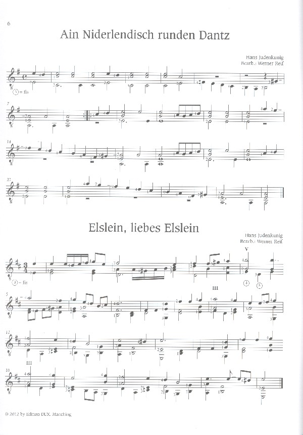 Reif, Werner, arr. Ain Niederlendisch Runden Dantz (Judenkunig) Courante 1 (Anonymus) Courante 2 (Anonymus) Courante 3 (Anonymus) Courante 4 (Anonymus) Das ander Priamell (Judenkunig) Das Erst Priamell (Judenkunig) Der Hupff Auff ( Zum Welschen Tantz) (Newsidler) Drei Stucken (Allemande, Ballet, Courante) (Anonymus) Ein Guts Hofftenzlein Für Ein Schuler (Newsidler) Ein Gut Trium / Mit schoenen Fugen (Newsidler) Elslein, liebes Elslein (Judenkunig) Elslein, Liebstes Elslein Mein (Newsidler) Entlaubt Ist Uns Der Walde (Newsidler) Fantasia (Waissel) Galliarda Aliter Nürnberger Lautenbuch Gassenhawer Nahs (Newsidler) Hie Folget Ein Welscher Tantz Wascha Mesa (Newsidler) Hupff Auff (Newsidler) Ich Bin Ir Lang Zeyt Hold Gewesen (Judenkunig) Ich Gieng Wol Bey Der Nacht (Newsidler) Ich Stand An Einem Morgen (Newsidler) In Liebes Brunst (Newsidler) Kalata Ala Spagnola (Judenkunig) Lamorac Isaac (Newsidler) Mag Ich Unglück Nit Widersten (Judenkunig) Mein Fleiss un Mu (Newsidler) Pathentiam Muss Ich Han (Gerle) Pavan Stephan Craus Phantasia (Waissel) Praeambulum (Waissel) Praeambel 3 (Newsidler) Ronde Tielman Susato Rossina (Judenkunig) Rossina, Ain Welscher Dantz (Judenkunig) Woll Kumpt Der May (Judenkunig) Wo Soll Ich Mich Hin Keren Ich Armes (Judenkunig)