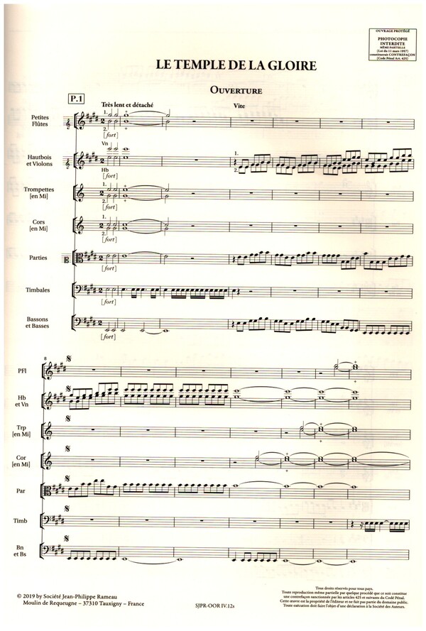 Dubruque, Julien, ed Fête in einem Prolog und drei Akten Symphonien / Fassungen von 1746 und 1745 Rameaus einzige erhaltene Oper auf ein Libretto von Voltaire ist in zwei Fassungen (1745 und 1746) überliefert, wobei diejenige von 1745 lange als verschollen galt. Mit dem Band IV.12 der Opera omnia Rameau liegt nun erstmals eine vollständige Ausgabe vor, die die Aufführung beider Fassungen ermöglicht. Voltaire beruft sich in seinem Libretto auf Metastasio, indem er die Oper aus dem galanten Milieu befreien wollte, um sie zu einem moralisierenden, so erbaulichen wie politischen Bühnenkunstwerk zu machen. Nach einem dem personifizierten Neid gewidmeten Prolog werden der Tyrann Bélus und der Tyrann Bacchus aus der Ruhmeshalle verjagt und wird schließlich Trajan mit Lorbeer gekrönt, weil er die Rebellen besiegte, ihnen verzieh und schließlich die Ruhmeshalle in einen öffentlichen Tempel verwandelte. Die Musik enthält viele bemerkenswerte Passagen, z. B. eine reich besetzte Ouvertüre, den berühmten Monolog Profonds abîmes du Ténare mit obligaten Fagotten oder Trajans raffinierte finale Szene Ramage doiseaux. Nun liegen auch die instrumentalen Einzelsätze aus der Oper in gewohnter Weise als praktische Einzelausgabe vor. Das Aufführungsmaterial ist leihweise erhältlich.