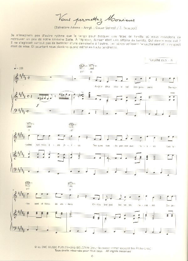 Les plus grandes chansons Vous permettez Monsieur Tombe la neige Les mains dur tes hanches La nuit Ma tête Le ruisseau de mon enfance C'est ma vie Pauvre Verlaine Les filles du bord de mer Amour perdu J'avais oublié que les roses sont roses En Blue-Jeans et blouson de cuir Le néon Au café du temps perdu Inch'allah Un air en fa mineur Ce George Tant d'amour qui se perdBEUSC00568 Bookmakers International - Patrick Moulou