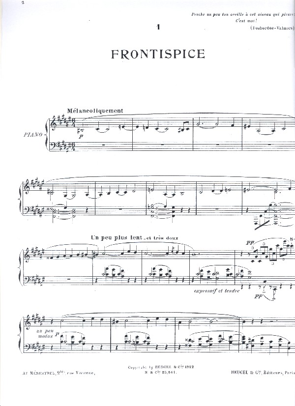 Poèmes Suite no.1 Frontispice Andromède résignée Douloureuse rêverie dans un bois de sapins Le Bouquet de Pensées Soleil d'Automne Gretchen Les Deux Echarpes Liebe ! Liebe Eros caché dans les bois La fausse indifférence Chanson de Midi Antiochus Nevermore Portrait L'Enfant au Perroquet Les Rêveries du Prince Eglantine Ivresse L'Arome suprême Berceuse Féroce Passante Ouranos Les Héliotropes du Clos-Andre Effet de nuit sur la Seine Per i piccoli canali (Venise) Mirage Danse de l'Amour et du Danger Matinée parisienne Chérubin tragique