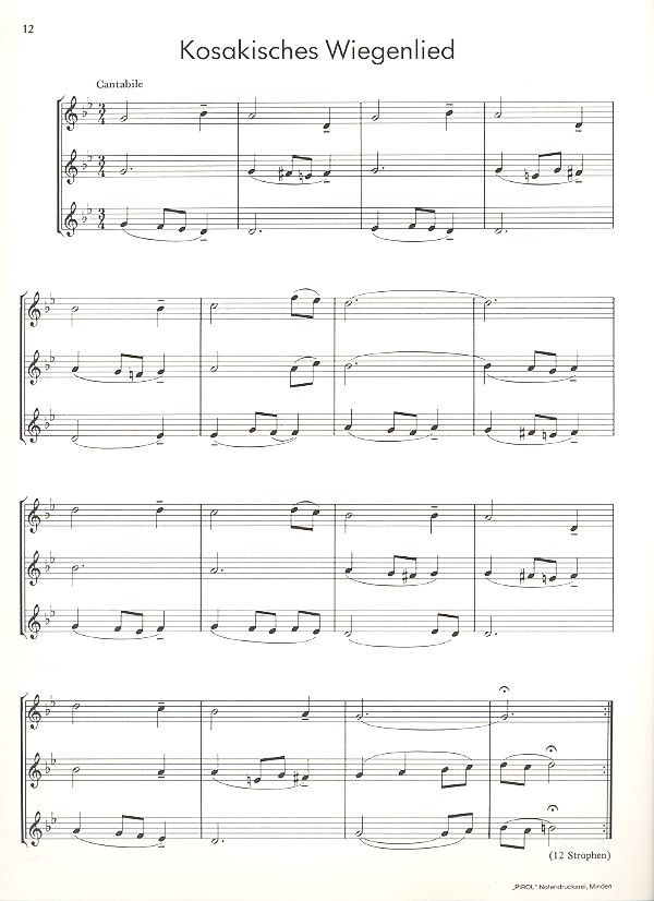 Russische Volkslieder Folk-Song Trios for three Tritt das Mägdlein aus dem Tor Kommt ein flotter Bursch daher Auf der Kasanka Hälmchen kann am großen Halme Dicht am Flüsschen Was ich alles hier im Kasten Du mein Streifen karges Bauernland Nun sind wir heut zum letzen Male In der Schmiede Auf glattem Wolgaeise Der Ziegenbock Kosakisches Wiegenlied