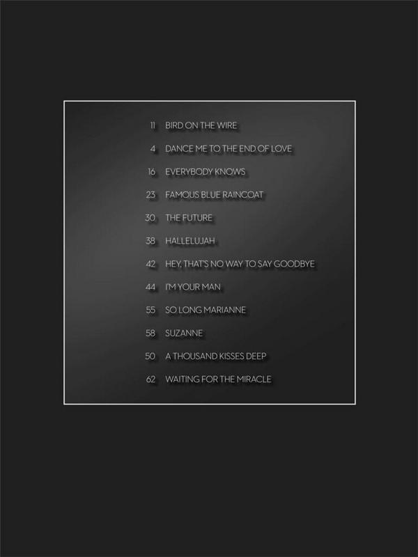12 Classics Bird On The Wire (Bird On A Wire) Dance Me To The End Of Love Everybody Knows Famous Blue Raincoat The Future Hallelujah Hey, That's No Way To Say Goodbye I'm Your Man So Long Marianne Suzanne A Thousand Kisses Deep Waiting For The Miracle