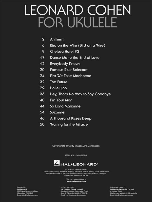 15 of Cohen's best Songs A Thousand Kisses Deep Anthem Bird On The Wire (Bird On A Wire) Chelsea Hotel #2 Dance Me To The End Of Love Everybody Knows Famous Blue Raincoat First We Take Manhattan Hallelujah Hey, That's No Way To Say Goodbye I'm Your Man So Long Marianne Suzanne The Future Waiting For The Miracle