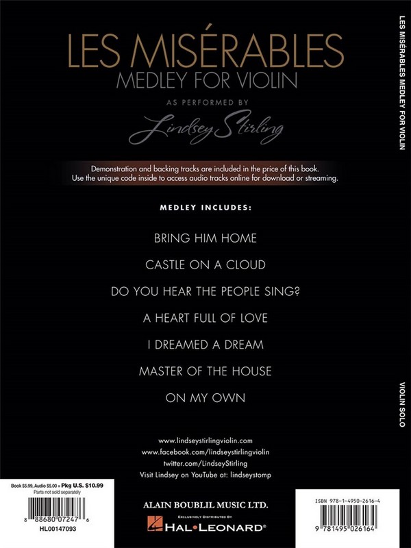 as performed by Lindsey Stirling Bring him home Castle on a Cloud Do You hear the People sing A Heart full of Love I dreamed a Dream Master of the House On my Own