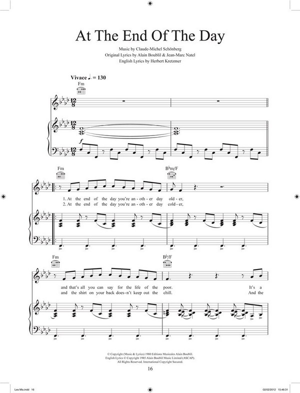 Kretzmer, H. english lyrics Boublil, A., original lyrics Natel, Jean-Marc, original lyrics At the End of the Day I dreamed a Dream Who am I Castle on a Cloud Master of the House STars Do You hear the People sing In my Life A Heart ful of Love On my own A little Fall of Rain Drink with Me Bring Him Home Empty Chairs at empty Tables