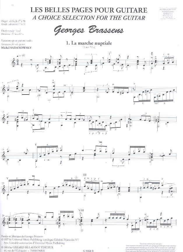 A choice Selection for Guitar Sadanowsky, Michel, arr. et ed La marche nuptiale Les amours d'antan Les funérailles d'antan Dans l'eau de la claire fontaine Marquise Il n'y a pas d'amour heureux Le petit joueur de fluteau Je me suis fait tout petit