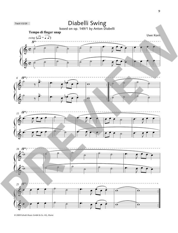 Korn, Uwe, arr. 14 jazzige Stücke für Klavier vierhändig Bald 200 Jahre währt nun schon die Erfolgsgeschichte von Diabellis 'Melodischen Übungsstücken' op. 149 für Klavier zu vier Händen. Schöne Melodien im Umfang von nur fünf Tönen, für Anfänger bestens geeignet, dazu raffinierte und meisterhaft gestaltete Begleitsätze im Secondo-Part. Bis heute erfreuen sich die Stücke großer Beliebtheit bei Schülern, Lehrern und Musikliebhabern. Diabelli, geboren 1781, war in Wien nicht nur ein angesehener Klavierlehrer und Komponist, er war auch ein geschäftiger Musikverleger und Freund Ludwig van Beethovens, der ihn zuweilen scherzhaft 'mein Diabolus' nannte. Manchmal schickte er selbstkomponierte Themen an die bekannten Komponisten seiner Zeit, mit der Bitte, sie mögen ihm doch einige Variationen darüber zukommen lassen. So entstanden beispielsweise die berühmten Diabelli-Variationen von Beethoven, ein anspruchsvolles Klavierwerk, das bis heute in den Konzertsälen der Welt zu hören ist. Herr Diabelli wird hoffentlich nicht böse darüber sein, dass in diesem Heft einige seiner wunderbaren Fünftonmelodien in die Welt des Swing, der Samba und anderer Ausdrucksformen transportiert wurden? Außer einigen bearbeiteten Melodien aus Opus 149 gibt es noch ein paar neu angefertigte Stücke, allesamt inspiriert von dem Diabelli-Gedanken, mit fünf Fingern möglichst abwechslungsreich Musik machen zu dürfen. Die sinnvolle Anordnung der Tonarten wurde beibehalten. Neue Impulse für den Klavierrunterricht und das vierhändige Klavierspiel! Andante op.149 No. 1 Diabelli Swing Waltzing Diabelli Salsa Diabolica The Sigh Five Fingers Swing Rocking Horseshoes Diabelli do Brazil It's a Long Way Swing à la Viennoise The Publisher's Heartache Diabelli Goes Jamaica Alla Argentina Guinea Pigs in a Salad Bar Minor Memories
