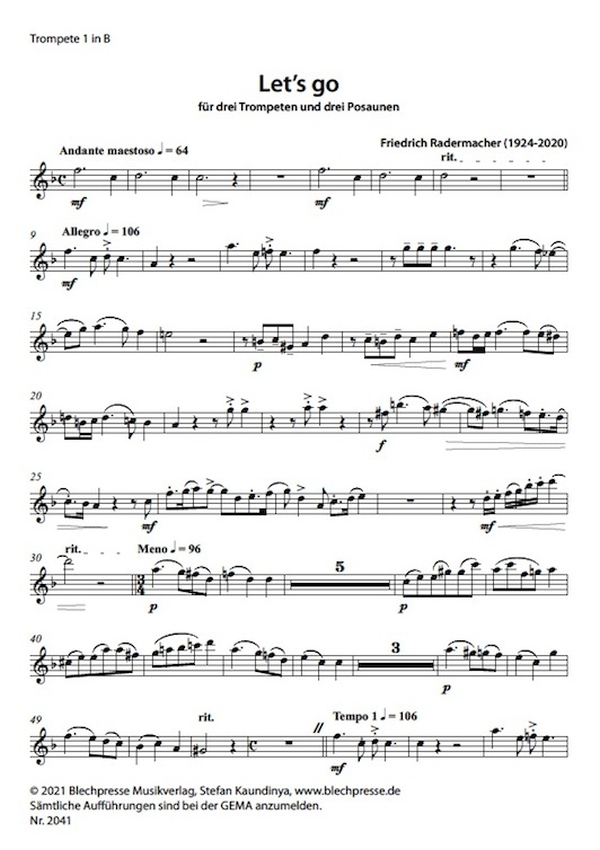 Berkel, Matthias, arr. Dieses Werk ist besonders konditionell in allen Stimmen eine echte Herausforderung. Radermacher schrieb das Stück für seinen Enkel und dessen Kollegen vom SWR Sinfonieorchester. Wer das gut aufgeführt, kann sich der Bewunderung und Anerkennung des fachkundigen Zuhörers sicher sein!