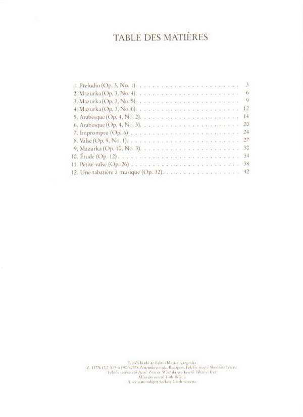 Preludio op.3,1 Mazurka op.3,4 Mazurka op.3,5 Mazurka op.3,6 Arabesque op.4,2 Arabesque op.4,3 Impromptu op.6 Valse op.9,1 Mazurka op.10,3 Étude op.12 Petite valse op.26 Une tabatière à musique op.32
