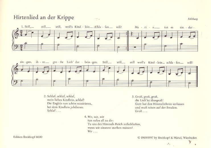 Walter, Heinz, ed 30 Weihnachtslieder Alle Jahre wieder Als ich bei meinen Schafen wacht Das alte ist vergangen Der Heiland ist geboren Ein Kind ist uns geboren heut Es ist ein Ros entsprungen Es kommt ein Schiff geladen Es ziehn aus weiter Ferne Ich steh an deiner Krippen hier Ihr Hirten erwacht Ihr Kinderlein kommet In dulci jubilo Joseph lieber Joseph mein Kommet ihr Hirten Leise rieselt der Schnee Maria durch ein Dornwald ging Morgen kommt der Weihnachtsmann O Heiland reiß die Himmel auf O Tannenbaum Still o Himmel Still still still Stille Nacht Vom Himmel hoch Was soll das bedeuten für Klavier zu 4 Händen : - Es hat sich heut eröffnet - Es wird scho glei dumpa - Lobe den Herren - O du fröhliche - Seht das kleine