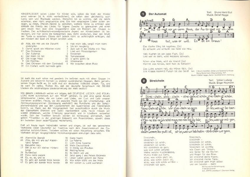 Abendstille überall Ach, waren das finstre Zeiten Alle, die mit uns auf Kaperfahrt fahren All, die mit und die Zukunft erkämpfen Alle Räder stehen still All my bags are packed All the leaves are brown Am Abend spät huscht eine Maus Am Donnerstag war ich noch frei Am Grunde der Moldau Auf, Matrosen, ohé Avec ma gueule de métèque Bajuschki baju Beresinalied Bet und arbeit Bin ja nur ein kleiner Hirtenjunge Bringe mir, weites Meer Bundeslied California dreamin' Carry it on Cath the Wind Corne, gather 'round people Corinna Da fuhr von Hamburg mol son alten Kasten Da kommt unsre Postfrau Damit spielt ein Mädchen nicht Das Einheitsfrontlied Das Lied von der Gedankenfreiheit Das Lied von der Moldau Das macht doch nichts, das merkt doch keiner Das Orchester Das war die Hanna Cash Denn ich will Der Automat Der Hahn ist tot Der zehnte Juli in Seveso Die Ballade von der Hanna Cash Die Ballade von Seveso Die Einheitsfront -Die Gedankenfreiheit Die Geige, die singt Die Kakerlake Die kluge Maus Die Postfrau Die Resolution Dies Land ist dein Land Dirty old town Dona nobis pacem Drei Chinesen mit dem Contrabaß Du hast so schöne Haare Du Mädchen, was stehst du so Dunkle Wolk' Dunkle Wolk Edeltraud Ein Elefant wollt bummeln gehn Ein Wind weht von Süd . El condor pasa Es geht ein dunkle Wolk herein Es, es, es und es Es war einmal ein reicher, alter Mann Everybody loves saturday night Frau Lorenz lag mit einem Mann Freight train Frühlingslied Galleus meus mortus est Girl Go, tell ist on the mountain Gode Nacht Große Uhren gehen tick-tack Gute Nacht, Freunde Hab mich lieb, vergiß michh nicht Hamburger Süßholz Hanna Cash Hei, ßoreasati, korasti Help me make it thru the night He's got the whole world in his hands Heute hier, morgen dort I'd rather be a sparrow than a snail I met my love Ich bin neugierig Ich will den Tag nicht halten Ihr sogenannten Herrn In Erwägung unserer Schwäche In the chilly hours and minutes Is there anybody Ja, ich vin neugierig Jack saß in der Küche mit Tina Jan und Hein und Klaas und Pit Jan und Ulla, Klaus und Britt Jetzt haben sie ihr Gesicht gezeit Joan was quizzical Juan sin tierra Kinder Komm laß dich nicht erweichen La cucarache La paloma Leaving on a jet plane Le coq est mort Le deserteur Le mét`que Lemon tree Lied vom Privateigentum Lütt Anna Susanna Manchmal bastel ich mit einem richtigen Radiogerät Manchmal träume ich schwer Mary Hamilton Maxwell's silver hammer Mein Deutschland Michelle Mit dem Rock von Kattun Monsieur le Président Morgens, wenn ich früh aufsteh' Morning has broken O König von Preußen Once upon a time there was a tavern Öwer de stillen Straten Pelago, pelago Peters Brünnele Rolling home Sa lunka vi sa smaningom Saturday night Schweint das Grab dir tief Schlaf mein Bub Sein Arbeit, die gefällt mir nicht Seveso-Ballade Show me a prison Sieben Tage lang Sind so kleine Hände So trolln wir und So vergeht Jahr um Jahr Streicheln Suzanne Take the ribbon from your hair Tell it on the mountain The cock is dead The times they are a-changin' There but for fortune There's a man by my side walkin' This land is your land This land was made for you and me Those were the days Ti pempti imun lefteros Tomatensalat U gonni gonni ßa Uhrenkanon Und du, du bist genau Uns jetzt gang i ans Peters Brünnele Und wil der Mensch ein Mensch ist Und weil Frankfurt so groß ist Und wenn ein Mann einen Mann liebt Unser Leben gleicht der Reise Unter dem Pflaster liegt der Strand Vital Michalon, gest. 31.7.1977 Was sollen wur trinken Wat zullen wie drinken Weil wir das Leben lieben When I was just a lad of ten Wie schön blüht uns der Maie Wir brauchen ein Platz Wir haben jetzt die Schnauze voll Wir waren im letzten Herbst wie eingefroren Wir wollen zu Land ausfahren Woran sieht man der Ampel Word is to the kotchen gone Zeven dagen lang