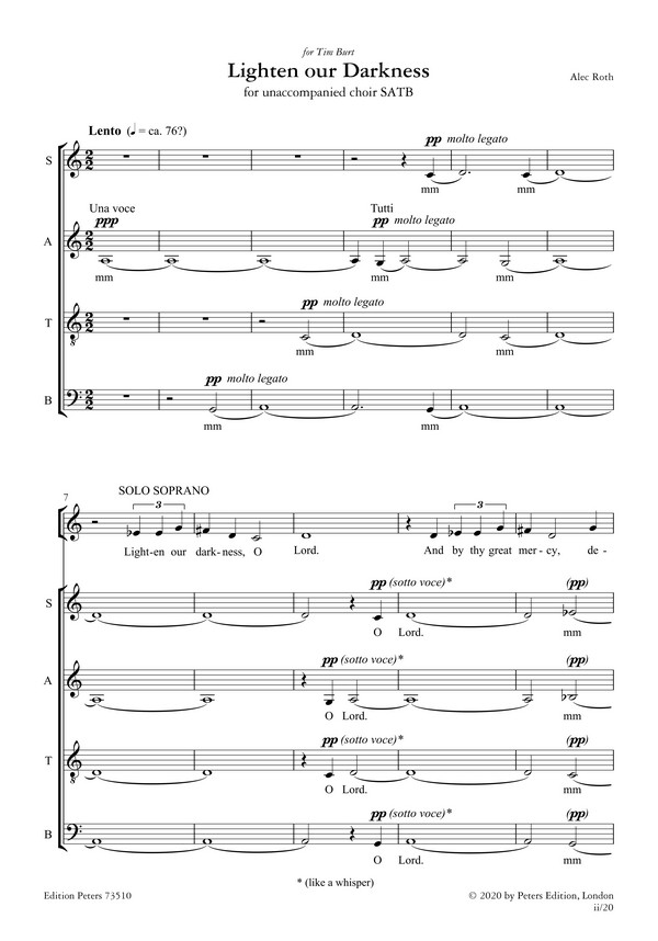 Lighten our Darkness by Alec Roth is a contemporary sacred choral work or unaccompanied SATB choir. The words are taken from the Third Collect at Evening Prayer, Book of Common Prayer 1662. Lighten our Darkness was commissioned by Professor Tim Burt to mark his retirement as master of Hatfield College, University of Durham and first performed by the Chapel Choir, directed by Jonathan Allsopp, at Evensong, Hatfield College Chapel, on 22 June 2017. The complete Evensong service composed for Hatfield College consists of the following items: EP73510 Lighten our Darkness (Introit) EP73511 Responses EP72823 Magnificat and Nunc Dimittis EP72602 Sol Justitiae (Anthem)