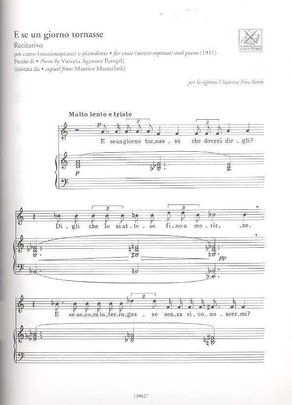 Art songs : E se un giorno tornasse Il tramonto Deità silvane I fauni Musica in horto Egle Acqua Crepuscolo 5 liriche : Tempi assai lontani Canto funebre Par les soirs Par l'étreinte La fine La donna del sarcofago La statua 4 liriche : No non è morto il figlio tuo La mamma è come il pane caldo Io sono la madre Mattino di luce