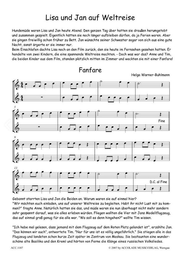 Fanfare Auf dem Roten Platz Walzer unterm Eiffelturm Tims Tango Jan auf Jamaika Der kleine Chinese Die großen Elefanten Bei den Beduinen Pizza in Rom Spanischer Tanz Julischkas Lied Aus Schottland In den Bergen Alles nur geträumt In 14 kleinen Stücken gehen Lisa und Jan auf Weltreise. Der beigefügte Text hat sich in zahlreichen Konzerten bewährt!
