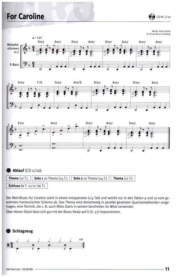 Elemente des Souls, Blues und Jazz sind, verschmolzen mit dem jeweils aktuellen Musiktrend, seit langem fester Bestandteil der aktuellen Popmusik. Dieses Heft nimmt die Schülerinnen und Schüler mit in die 1960er-Jahre, als diese Form der Verschmelzung unter anderem als tanzbarer Soul Jazz erstmalig populär wurde. Bekannte und eingängige Stücke von Jazz-Größen wie Miles Davis, Herbie Hancock, Joe Zawinul oder McCoy Tyner sowie vier Eigenkompositionen von Felix Janosa (dem Komponisten von Ritter Rost), arrangiert für Schulklasse, Bläserklasse oder Schulband bieten einen authentischen und motivierenden Einstieg in dieses Genre. Die Stücke sind didaktisch aufbereitet und flexibel einsetzbar. Neben Instrumentalstimmen für fortgeschrittene Spielerinnen und Spieler beinhaltet das Heft einfachere Stabspielstimmen mit Buchstabennotation für weniger Erfahrene. Auf der Begleit-CD sind authentische Originaleinspielungen der Songs sowie Playbacks enthalten. Freddie Freeloader For Caroline Walk Spirit, Talk Spirit Cantaloupe Island Soul Kitchen Mercy, Mercy, Mercy Mo Jive A Good Idea