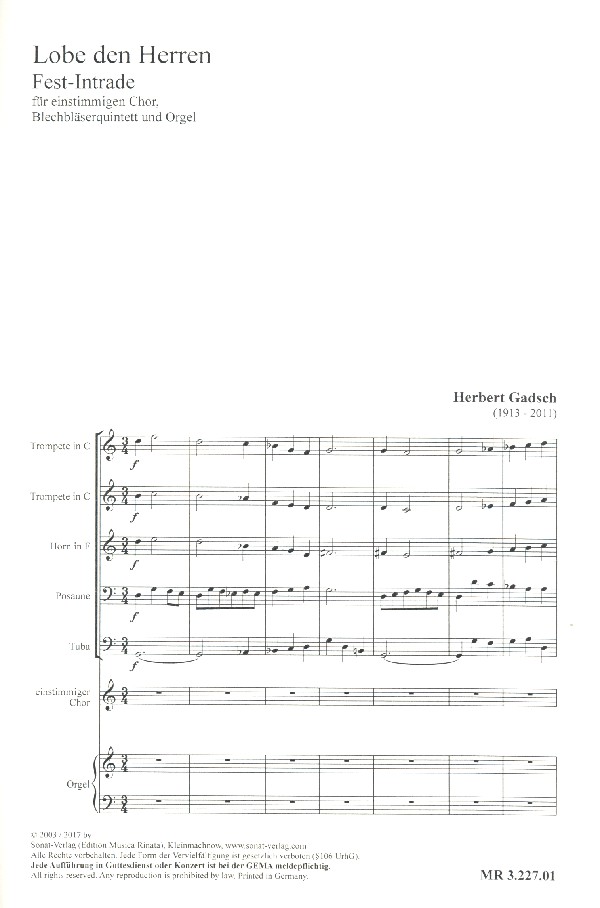 | Untertitel: | für Chor unisono, 5 Blechbläser und Orgel Partitur |