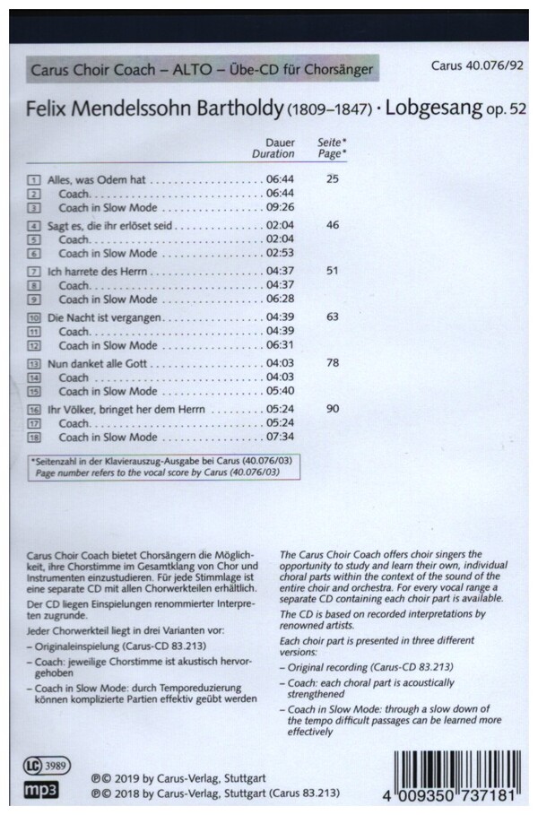 Carus Choir Coach Originaleinspielung Coach mit Klavierbegleitung (und Originaleinspielung im Hintergrund) Coach in Slow Mode (Temporeduzierung)