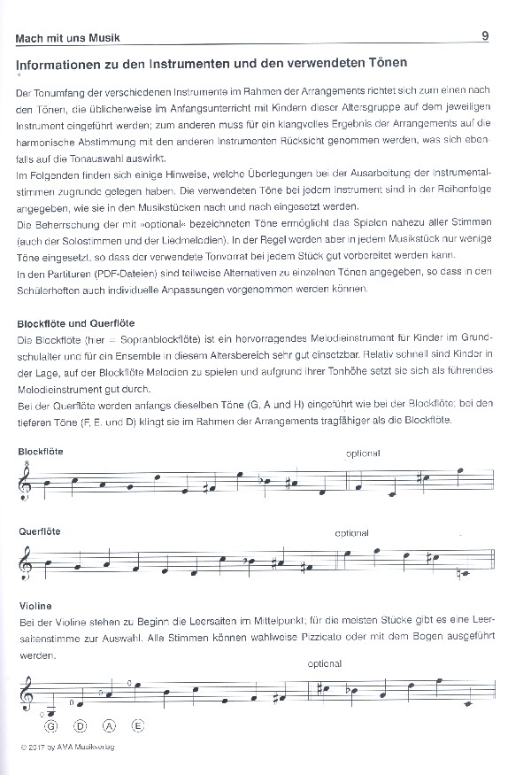 Musizieren im Ensemble begleitend zum Instrumentalunterricht in der Grundschule »Mach mit uns Musik« ist ein Unterrichtsprogramm für das gemeinsame Musizieren im Ensemble oder Orchester. Es richtet sich an Kinder im Grundschulalter und kann direkt vom Beginn des Instrumentalunterrichts an verwendet werden. Die hier enthaltenen Musikstücke sind für die Beteiligung folgender Instrumente arrangiert: Blockflöte, Querflöte, Violine, Mandoline, Gitarre, Violoncello, Klavier, Keyboard, Akkordeon, Klarinette und Trompete. Das Konzept ist gegliedert in 22 Unterrichtseinheiten, in deren Mittelpunkt Lieder und einfache Instrumentalstücke stehen. Zu Beginn des Programms spielt das Singen gegenüber dem Instrumentalspiel eine große Rolle, aber mit zunehmendem instrumentalen Können werden die Instrumente immer stärker eingesetzt. Die Arrangements sind so angelegt, dass neben dem jeweiligen konkreten Vorschlag auch flexible Lösungen einfach zu erstellen sind: Klare formale Abschnitte, überschaubare Phrasen und unterschiedlich schwere Stimmen ermöglichen das Mitspielen für Kinder aller Leistungsstufen. Die Lehrkräfte sind im Rahmen dieses Unterrichtsprogramms nicht nur die anleitenden Personen, sondern gleichzeitig aktive Mitspieler des Ensembles/Orchesters. Sie unterstützen mit ihrem Können das klangvolle Musikerlebnis für die Kinder. Auf diese Weise können die Musikstücke auch dann gespielt werden, wenn nur ein Teil der Schülerstimmen besetzt werden kann. »Mach mit uns Musik« umfasst 6 Schülerhefte: Schülerheft 1 für Blockflöte und Querflöte (AMA Nr. 610499) Schülerheft 2 für Violine und Mandoline (AMA Nr. 610500) Schülerheft 3 für Gitarre (AMA Nr. 610501) Schülerheft 4 für Violoncello (AMA Nr. 610502) Schülerheft 5 für Klavier, Keyboard und Akkordeon (AMA Nr. 610503) Schülerheft 6 für Klarinette und Trompete (jeweils C- und B-Instrumente) (AMA Nr. 610504) Für die Lehrkräfte gibt es den Lehrerband, der die Begleitstimmen für Klavier und Gitarre enthält. Zusätzlich bietet der Lehrerband Unterrichtshinweise für die Einstudierung der Musikstücke bzw. für die Gestaltung der Unterrichtsstunden. Bei einigen Unterrichtseinheiten sind im Lehrerband auch die entsprechenden Seiten der Schülerhefte abgebildet (jeweils aus dem Schülerheft 1 für Blockflöte und Querflöte), um die Einstudierung mit einer guten Übersicht aus der Perspektive der Schülerhefte zu erleichtern. Zum Lehrerband können über den AMA-Verlag ergänzende Materialien (PDF-Dateien) bezogen werden, die die Gestaltung der einzelnen Unterrichtseinheiten des Programms ausführlicher erläutern als diese »Kurzanleitung« , und die die kompletten Partituren und die Vorlagen für Arbeitskarten enthalten. Viel Erfolg und Vergnügen beim Musizieren mit Kindern!