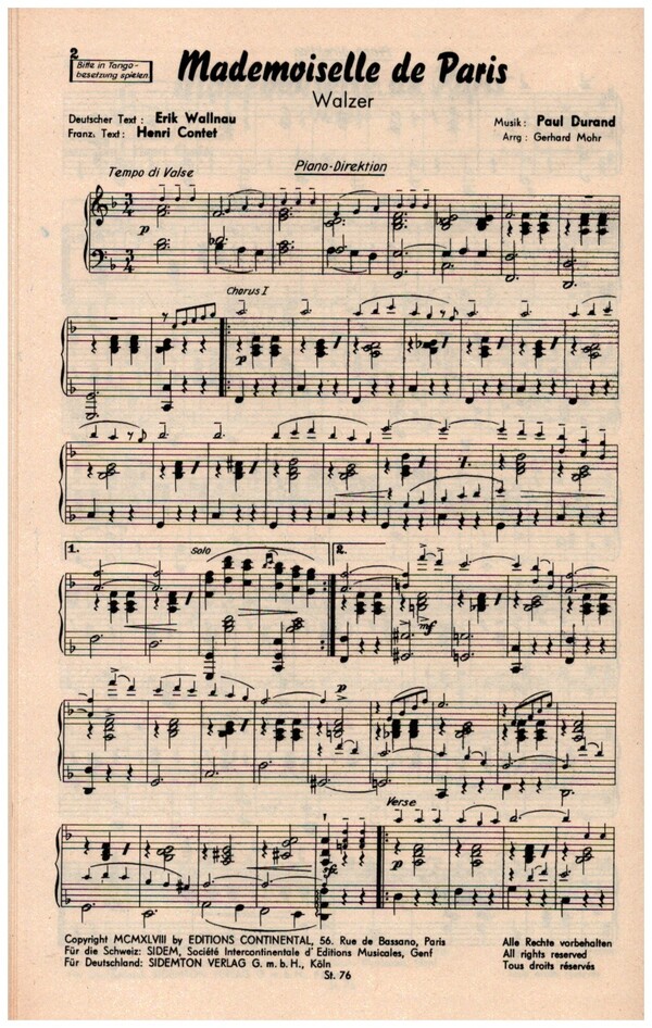 Wallna, Erik, dt. Text Contet, Henri, Text Mohr, Gerhard, arr.