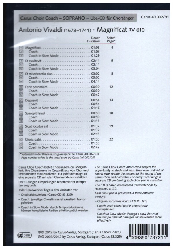 Carus Choir Coach Originaleinspielung Coach mit Klavierbegleitung (und Originaleinspielung im Hintergrund) Coach in Slow Mode (Temporeduzierung)