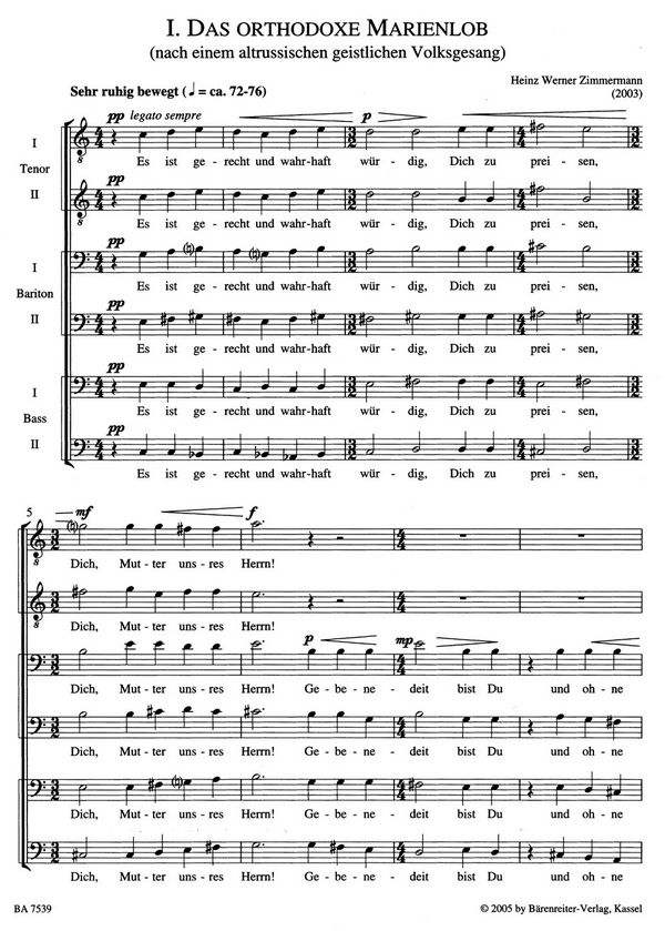 Das orthodoxe Marienlob (TT Bar Bar BB) Das evangelische und katholische Marienlob SSAATBB SSAATBB Das islamische Marienlob (S Mezzos AT Bar B)