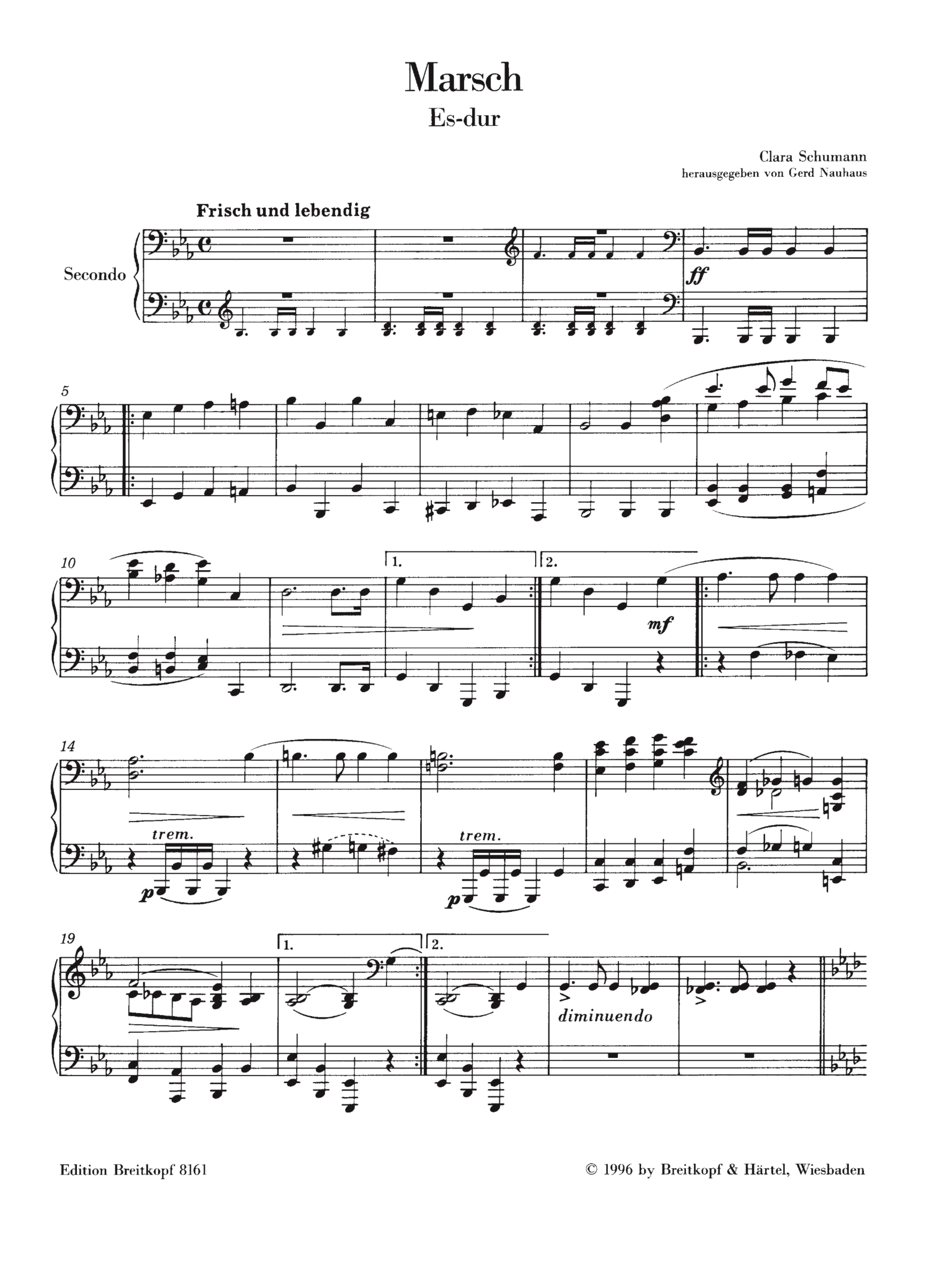 Nauhaus, Gerd, ed Die zwei Klaviereditionen (EB 8161/EB 8162) erschienen zum Clara Schumann-Jahr 1996 (100. Todestag). Bei dem Marsch handelt es sich um das letzte, kaum bekannte Werk der Komponistin die Romanzen bilden eine kleine Werkgruppe, die bisher nur in dem Sammelband Brahms und seine Freunde (EB 8303) lieferbar war.