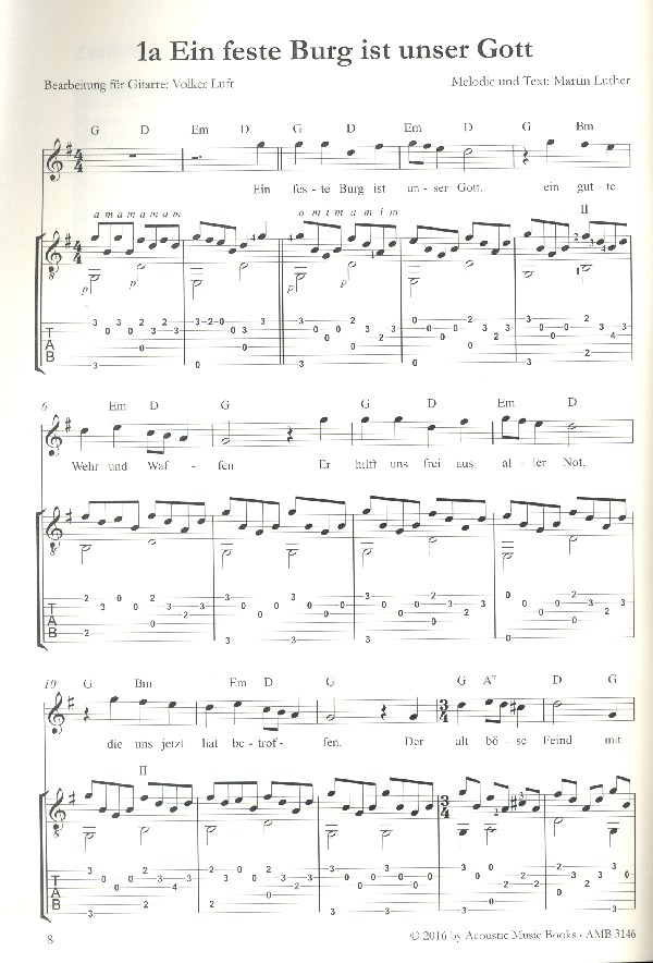 Luft, Volker, arr. Luther, Martin, Text 17 Lieder Ein feste Burg ist unser Gott Vom Himmel hoch da komm ich her Verleih uns Frieden gnädiglich Aus tiefer Not schrei ich zu dir Nun komm der Heiden Heiland Christe du Lamm Gottes Erhalt uns Herr bei deinem Wort Nun freut euch liebe Christen g'mein Vom Himmel kam der Engel Schar Wär Gott nicht mit uns diese Zeit Mit Fried und Freud fahr ich dahin Jesaja dem Propheten das geschah Kyrie eleison Ach Gott vom Himmel sieh darein Christ lag in Todesbanden Christ unser Herr zum Jordan kam Ein neues Lied wir heben an Martin Luther komponierte mit der Laute und Flöte seine weltbekannten Lieder Eine Feste Burg ist unser Gott, Vom Himmel hoch und viele andere. Er liebte das Singen und das Saitenspiel und trug seine Lieder - sozusagen als Urvater der heutigen Singer/ Songwriter - selbst vor und begleitete sich dabei auf der Laute. Martinus Luthers Saitenspiel greift diese Tradition auf und bietet Freunden mittelalterlicher Musik, Gitarristen, Gitarrenlehrern, Sängern und christlichen Musikgruppen eine Sammlung mit Bearbeitungen aller von Martin Luther komponierten Lieder. Sie sind jeweils für Gitarre solo und für Gesang und Gitarre eingerichtet worden. Die Lieder erweitern das Repertoire und eignen sich bestens für die Gestaltung von Gottesdiensten und Konzerten, den Instrumentalunterricht und das Musikschulvorspiel. Noten, DIN A4, 80 Seiten Inhalt: Ein feste Burg ist unser Gott - Vom Himmel hoch, da komm ich her - Ein neues Lied wir heben an - Aus tiefer Not schrei ich zu dir - Mit Fried und Freud fahr ich dahin - Christ lag in Todesbanden - Verleih uns Frieden gnädiglich - Nun komm' der Heiden Heiland - Christe, du Lamm Gottes - Erhalt uns Herr bei deinem Wort - Nun freut euch, liebe Christen g'mein - Vom Himmel kam der Engel Schar - Wär Gott nicht mit uns diese Zeit - Jesaja dem Propheten das geschah - Kyrie eleison - Ach Gott, vom Himmel sieh darein - Christ, unser Herr, zum Jordan kam