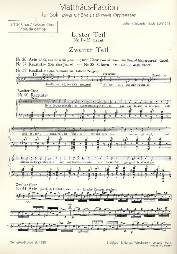 | Untertitel: | für Soli, gem Chor und Orchester Viola da Gamba 1.+2.Chor mit Ersatzstimme (Violoncello solo) |