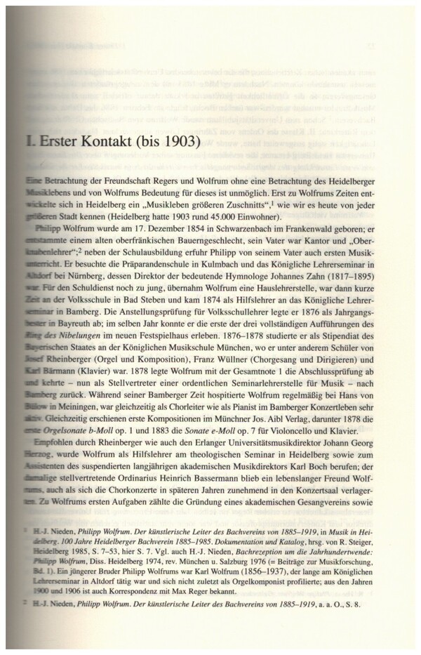 Schriftenreihe des Max-Reger-Instituts Band 25 Schaarwächter, Jürgen, ed Philipp Wolfrum (1854-1919), Heidelberger Universitätsmusikdirektor und Leiter des Heidelberger Bachvereins, war bekannt als Förderer zeitgenössischer Musik im Heidelberger Musikleben, doch war sein Interesse gleichermaßen auf Johann Sebastian Bach gerichtet. Diese beiden Bereiche, dazu ein ähnlicher Humor und vergleichbares Arbeitsethos, resultierten in einer lebenslangen Freundschaft zwischen ihm und Max Reger. Nach erster Kontaktaufnahme 1901 führte ab 1905 das gemeinsame Konzertieren auf zwei Flügeln, zumeist mit Werken von Bach und Reger, zur Prägung der Phrase Max und Moritz. Ab 1906 konnte Reger in Heidelberg eigene Kompositionen dirigieren, und Reger setzte sich für die Aufführung besonders von Wolfrums Weihnachtsmysterium ein.