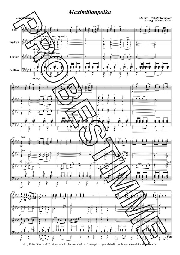 Die 'Maximilianpolka', ein Werk des Allgäuer Komponisten Willibald Hammerl, ist eine Hommage an seinen Sohn und ein echtes Highlight für Freunde der Blasmusik. Im böhmischen Stil gemütlich gehalten, entfaltet die Polka durch das Arrangement von 'Polka-König' Michael Kuhn ihre ganze Pracht. Wunderschöne, getragene Melodienbögen wandern spielerisch durch die Register des Orchesters und schaffen ein farbenfrohes Klangbild. Rhythmisch vielfältig und klanglich faszinierend bietet sie alles, was das Herz eines Musikers oder das des Zuhörers höher schlagen lässt: kraftvolle Bass-Soli, lyrische Tenor- und Flügelhorn-Passagen, brillante Trompeten-Signale und charmante und perkussive Durchgänge des Holzregisters. Ein Muss für jedes Blasorchester - die Maximilianpolka begeistert Musiker und Publikum gleichermaßen!