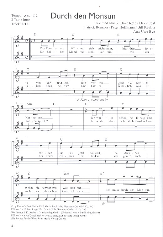 Flöten-Hits für coole Kids Schnappi das kleine Krokodil Durch den Monsun (Tokio Hotel) Irgendwie irgendwo irgendwann (Nena) Perfekte Welle (Juli) Feel (Robbie Williams) Father and Son (Ronan Keating / Cat Stevens) The Lion sleeps tonight (Tokens) Can you feel the Love tonight (Elton John) Aura Lee Oh happy Day By the Rivers of Babylon Guantanamera