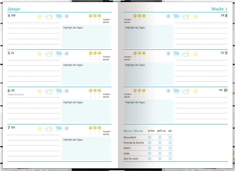 Tagebuch schreiben hilft uns, das Leben bewusster zu gestalten und den Alltag anders wahrzunehmen. Aber wer hat schon die Zeit dazu? Diese Kombination aus Terminkalender und Eintragbuch macht es möglich: Durch Ankreuzen und mit wenigen Worten wird in 3 Minuten das Wesentliche zusammengefasst und zeigt im Handumdrehen, was uns glücklich macht.