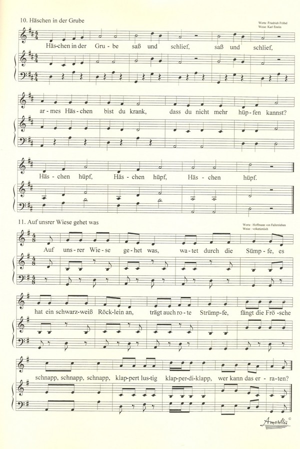 Scheungraber, Erich, arr. Ensemble 85 Volkslieder und Kinderlieder zu den Themen Spiellieder A, a,a, der Winter der ist da A, B, C, die Katze lief im Schnee Ach bittrer Winter Ach lieber Schuster An meiner Ziege Auf unsrer Wiese gehet was Bruder Jakob Bunt sind schon die Wälder Der Kuckuck und der Esel Der Mond ist aufgegangen Der Winter ist vergangen Die Blümelein die schlafen Die güldene Sonne voll Freud Die Mühle die braucht Wind Die Tiroler sind lustig Durch die Straßen Eine kleine Geige Ein Männlein steht im Walde Ein Vogel wollte Hochzeit machen Es geht eine Zipfelmütz Es klappert die Mühle Es tanzt ein Bi-Ba-Butzemann Es tönen die Lieder Es war eine Mutter Fing mir eine Mücke Froh zu sein Fuchs du hast die Gans Geh aus mein Herz Ging ein Weiblein Nüsse schütteln Gretel Pastetel Grün, grün, grün ist alles Grüß Gott du schöner Maien Häschen in der Grube Happy Birthday to you Heißa Kathreinerle Hejo spann den Wagen an Heut ist ein Fest Himmelsau licht und blau Hört ihr die Drescher Hopp, hopp, hopp Ich bin das ganzer Jahr vergnügt Ich bin der junge Hirtenknab Ich bin ein Musikante Ich geh mit meiner Laterne Im Märzen der Bauer Im meinem kleinen Apfel In Mutters Stübele In Schützelpütz Häusel Jetzt fängt das schöne Frühjahr an Jetzt fahrn wir übern See Kindlein mein schlaf doch Kommt ein Vogel geflogen Kuckuck, Kuckuck ruft's Laterne, Laterne, Sonne, Mond Liebe liebe Sonne Lobe den Herrn den mächtigen Mäh Lämmchen mäh Martin war ein frommer Mann Nun ruhen alle Wälder Ringlein, Ringlein du mußt wandern Sankt Martin Schäfer sag wo tust du weiden Schlaf mein liebes Kindlein Schneeflöckchen Weißröckchen Schuster gugu Singt ein Vogel Spannenlanger Hansel Steht auf ihr lieben Kinderlein Summ, summ, summ Sur le pont Suse liebe Suse Tanz Gretelein Trarira der Sommer Unsre Katz heißt Morle Viel Glück und Segen Wachet auf es kräht schon Was macht der Fuhrmann Weißt du wieviel Sternlein stehen Wer hat die schönsten Schäfchen Wer will fleißige Handwerker sehn Widele wedele Wide wide wenne Winter ade Zeigt her eure Füße Dieses Ensemblebuch für zwei Geigen und Cello (oder Bass) ist als Begleitbuch sowohl zur Geigen- und Bratschen- als auch zur Celloversion von Mein Liederbuch zu verwenden. Bei abweichenden Tonarten sind zwei Versionen eingefügt und entsprechend gekennzeichnet. Die 2. und 3. Stimme ist so gesetzt, dass das Buch auch als Klavierbegleitung dient. Um die Verwendungsmöglichkeiten nicht einzuschränken wurde auf Fingersatzbezeichnungen verzichtet. Der sich ergebende, dreistimmige Satz ist für Kinderohren leichter zu hören, als eine vierstimmige, akkordisch geprägte Begleitung.