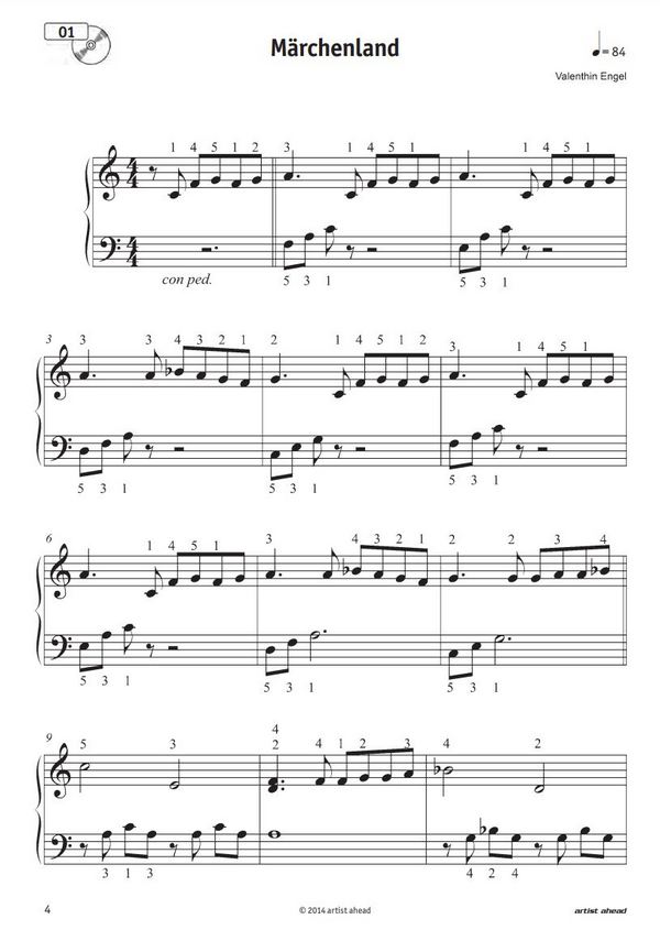 Sehr leichte, romantische Klavierstücke Bei vielen Klavierschülern entsteht bereits nach kurzer Zeit der Wunsch, ergänzend zum Unterricht mit einer Klavierschule, Stücke zu spielen, die schön klingen und Spaß machen - leider fehlte es hier bisher häufig an geeigneter Literatur. Nach jahrelanger praktischer Erfahrung im Klavierunterricht hat Erfolgsautor Valenthin Engel mit dem vorliegenden Klavierbüchlein diese Lücke schließen können. Entstanden ist eine Sammlung von 14 sehr leichten und schönen Klavierstücken, die das Arbeiten mit einer klassischen Schule sinnvoll ergänzen. Der optionale Download der Hörbeispiele dient als praktische Lernhilfe um den Ausdruck und die richtige Artikulation nachvollziehen zu können und auch als Soundtrack für unterwegs ist Mein erstes Klavierbüchlein ein Genuss. Download-Material & Audio-CD Unter www.artist-ahead-download.de stehen die enthaltenen Klavierstücke als Audio- und MP3-Dateien zum Download zur Verfügung. Märchenland Das Fohlen Die Spieluhr Am Horizont Der Fasan Heimweh Der Froschkönig Sommerregen Wassernymphen Im Hexenwald Der Pfau Der Springbrunnen Der Schwan Regenbogen