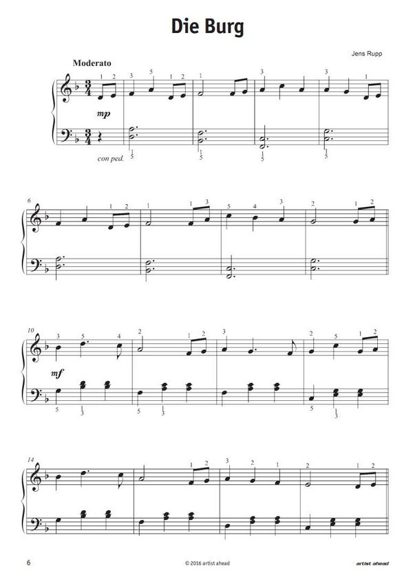 27 leichte, romantisch-klassische und moderne Klavierstücke Das Album Meine schönsten Klavierträume besteht aus 27 leicht zu spielenden Stücken, die von verschiedenen Stilrichtungen geprägt sind und den Spieler auf eine musikalische Reise durch bezaubernde Klang- und Bildlandschaften mitnehmen möchten. Es enthält klassische Elemente im Stile von Mozart und Beethoven, romantische und keltische Musik, sowie Einflüsse aus den Bereichen Filmmusik, Pop und Rock. Die Kompositionen sind für den Klavierunterricht ab dem zweiten Jahr - für Kinder ab 8 Jahren, Jugendliche und Erwachsene - geeignet und entsprechend der Schwierigkeitsgrade angeordnet. Zu Beginn sind die Stücke sehr leicht und werden im Verlauf des Buches allmählich anspruchvoller. Die verwendeten Tonarten sind die leichteren Dur-Tonarten C, G, F sowie die einfachen Moll-Tonarten Am, Em, Dm. Die in großer Notenschrift gehaltenen Kompositionen haben zumeist eine Länge von zwei Seiten, enthalten einprägsame Melodien und sind daher leicht zu erlernen. Trotz ihrer Einfachheit klingen diese kleinen Werke ausgesprochen schön und vollständig. Die klassischen Elemente sind auf moderne Art und Weise in die Stücke eingefügt und - besonders in der Begleitung der linken Hand - eine sehr gute Vorbereitung für die großen, klassischen Kompositionen der alten Meister. Auch für die Bereiche Film- und Pop-/Rock-Musik stellen sie einen optimalen Einstieg dar und es besteht für jeden die Möglichkeit, die Stücke für sich selbst zu entdecken und auf persönliche Weise zu interpretieren. Download-Material & Audio-CD Unter www.artist-ahead-download.de stehen die enthaltenen Klavierstücke als Audio- und MP3-Dateien zum Download zur Verfügung. Die Tänzerin Die Burg Emma Die Waldfee Winter Die Rose Herbstblätter Polarlicht Regenbogen Keltentanz Für Estelle Wunderland Der Ozean Irischer Tanz Sommer Die Sonne Mondlied Hochland Sternenlicht Der Traum Freunde Die Orchidee Liebeslied Abendrot Freiheit Nachtlied Glück