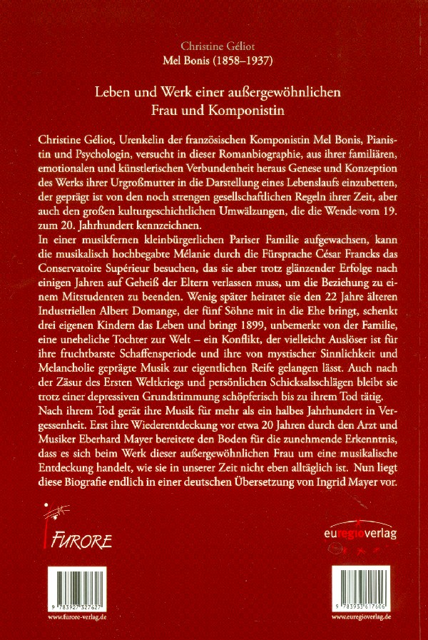 in Zusammenarbeit mit dem Verlag euregio Der Autorin Christine Géliot gelingt es, Leben und Werk ihrer Urgroßmutter anschaulich vor dem Hintergrund einer Gesellschaft darzustellen, die von den strengen Regeln ihrer Zeit und zugleich den großen kulturgeschichtlichen Umwälzungen geprägt ist, die die Wende vom 19. zum 20. Jh. kennzeichnen. In einer musikfernen Pariser Familie aufgewachsen, kann die musikalisch hochbegabte Mélanie durch die Fürsprache César Francks das Conservatoire Supérieur besuchen. Trotz glänzender Erfolge muss sie auf Geheiß der Eltern die Institution verlassen, um die Beziehung zu einem Mitstudenten zu beenden. Sie heiratet den 22 Jahre älteren Industriellen Albert Domange, der fünf Söhne mit in die Ehe bringt und schenkt drei eigenen Kindern das Leben. 1899 bringt sie unbemerkt von der Familie eine uneheliche Tochter zur Welt. Dieser Konflikt war wohl der Auslöser für ihre fruchtbarste Schaffensperiode. Die mystische Sinnlichkeit und Melancholie, die ihrer Musik innewohnt, nährt sich wohl aus ihrem tragischen Schicksal als unerfüllte Mutter und Liebhaberin. Mel Bonis Werk umfasst wunderbare Kammermusikwerke, weltliche und geistliche Lieder, Orgelkompositionen und Orchesterwerke sowie eine Fülle von Kompositionen für das Klavier. Ihre Musik ist reich an melodischer und harmonischer Inspiration, nimmt hin und wieder impressionistische Färbungen an, greift häufig zu unerwarteten rhythmischen Mustern und wagt auch hin und wieder kühne Ausflüge in tonale Grenzbereiche. Die zur Jahrhundertwende ringsum aufblühende Atonalität aber bleibt ihrem Wesen fremd. Nach ihrem Tod gerät ihre Musik in Vergessenheit. Erst ihre Wiederentdeckung vor etwa 20 Jahren bereitet den Boden für die zunehmende Erkenntnis, dass es sich beim Werk dieser außergewöhnlichen Frau um eine musikalische Entdeckung handelt, deren Talent und Beharrlichkeit in unserer Zeit als virtuos gilt.