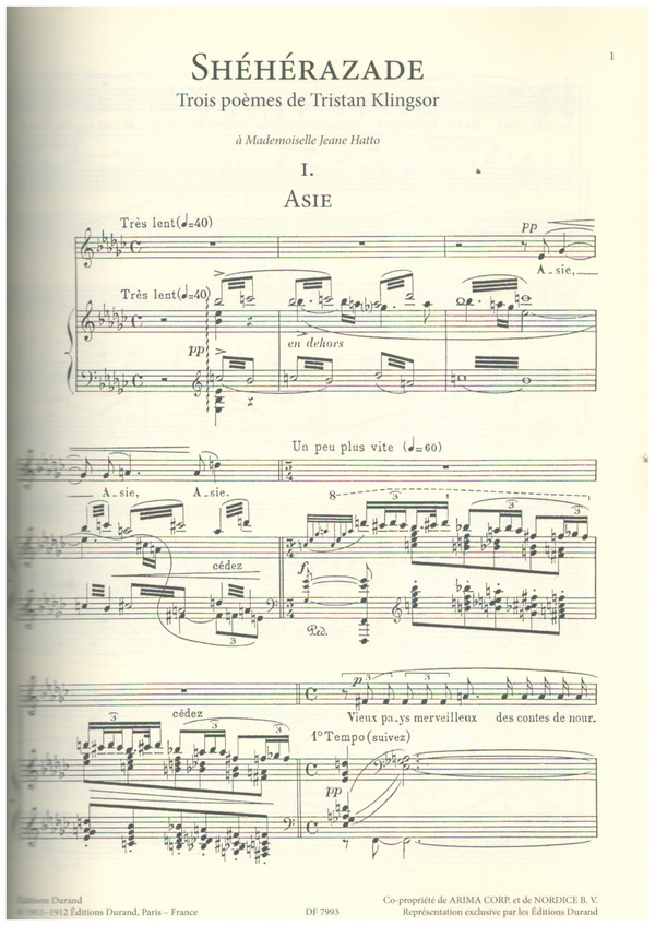 1. Asie (de: Shéhérazade: Trois poèmes de Tristan Klingsor) 2. La Flûte enchantée (de: Shéhérazade: Trois poèmes de Tristan Klingsor) 3. L'Indifférent (de: Shéhérazade: Trois poèmes de Tristan Klingsor) 4. Chanson de la mariée (de: Cinq mélodies populaires grecques) 5. Là-bas, vers l'église (de: Cinq mélodies populaires grecques) 6. Quel galant m'est comparable (de: Cinq mélodies populaires grecques) 7. Chanson des cueilleuses de lentisques (de: Cinq mélodies populaires grecques) 8. Tout gai! (de: Cinq mélodies populaires grecques) 9. Les grands vents venus d'Outremer (poème de Henri de Régnier) 10. Le Paon (de: Histoires Naturelles de Jules Renard) 11. Le Grillon (de: Histoires Naturelles de Jules Renard) 12. Le Cygne (de: Histoires Naturelles de Jules Renard) 13. Le Martin-pêcheur (de: Histoires Naturelles de Jules Renard) 14. La Pintade (de: Histoires Naturelles de Jules Renard) 15. Sur l'Herbe (poème de Paul Verlaine) 16. Chanson espagnole (de: Chants populaires) 17. Chanson française (de: Chants populaires) 18. Chanson italienne (de: Chants populaires) 19. Chanson hébraïque (de: Chants populaires) 20. Chanson écossaise (de: Chants populaires) 21. Kaddisch (de: Deux mélodies hébraïques) 22. L'Énigme éternelle (de: Deux mélodies hébraïques) 23. Nahandove (de: Chansons madécasses) 24. Aoua ! (de: Chansons madécasses) 25. Il est doux (de: Chansons madécasses) 26. Chanson romanesque (de: Don Quichotte à Dulcinée) 27. Chanson épique (de: Don Quichotte à Dulcinée) 28. Chanson à boire (de: Don Quichotte à Dulcinée)