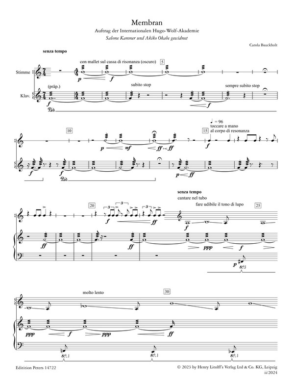 Commissioned by Internationale Hugo-Wolf-Akademie. 'A grand piano. At its keys, a pianist. Under its body, a professional singer, lying down. Both performers hold their own spiral hose, winding from mouth to piano. The soundboard forms the membrane between the performers. Membran was written for a festival of lieder songs for voice and piano. They asked me if it was possible for me to write a lied, says Carola. She began experimenting, singing through a tube into the body of the piano. She found the resonance haunting. During the piece, the two performers sing a German children's folksong to each other. In the song, a brother repeatedly asks his sister when they will go home. Each time, the sister says they will go home in time. In the end, it becomes clear that both have died. Carolas music is all about communication. She is particularly interested in the intensive interaction of elements that don't normally belong together. Tim Munro'