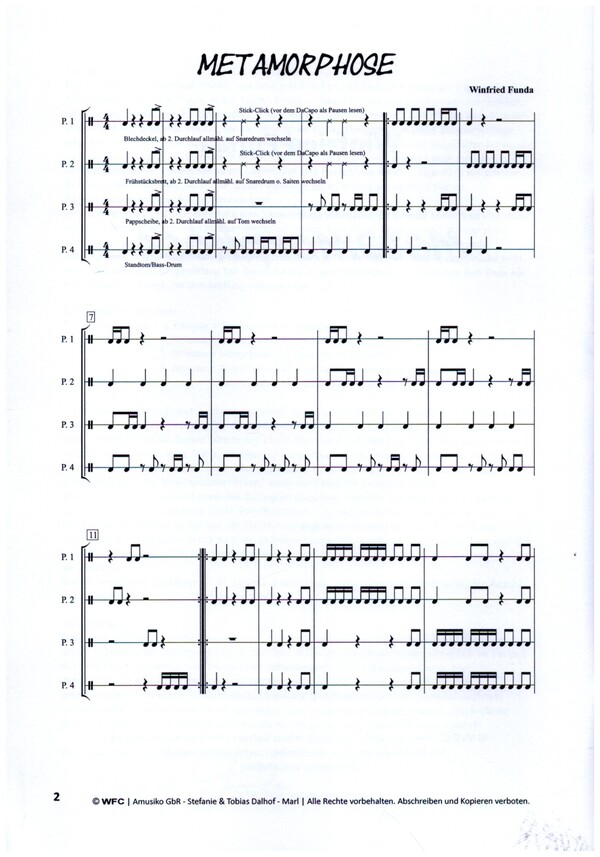 Winfried Funda Conceptions Der Begriff Metamorphose stammt aus dem griechischen und bedeutet soviel wie Umwandlung oder Verwandlung. Ich fragte in der ersten Probe zu diesem Stück meine mitwirkenden Schüler, ob ihnen die Bedeutung der Überschrift klar wäre. Einige kannten den Begriff aus dem Biologie-Unterricht und brachten ihn mit den verschiedenen Entwicklungsstadien eines Schmetterlings oder einer Libelle in Verbindung und konnten beschreiben, wie sich aus einer Raupe oder Larve, die sich später verpuppt, ein Fluginsekt entwickelt. Bei meinem Stück soll sich ebenfalls eine Verwandlung vollziehen. Im Grunde handelt es sich dabei um ein Trommelquartett, das in einer möglichst großen Besetzung, mindestens 3 Spieler pro Stimme, vorgetragen werden sollte. Die Trommeln werden jedoch zunächst durch Einsatz verschiedener Utensilien in ihrem Klang verfremdet. Erst in der zweiten Hälfte des Stücks tritt mehr und mehr der Originalklang der Instrumente in den Vordergrund, so dass sich zum Ende hin eine komplette klangliche Umwandlung vollzogen hat.