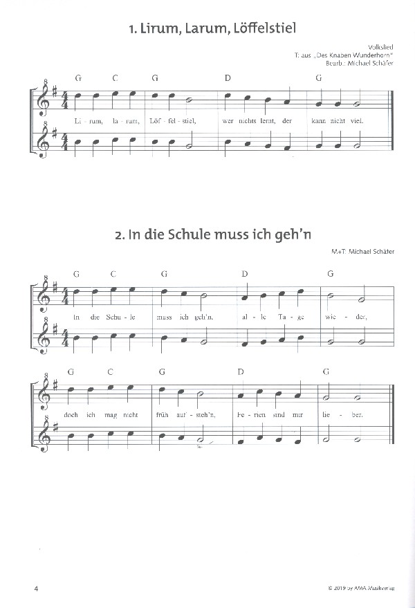 Schäfer, Michael, arr. 42 fröhliche Kinderlieder in leichten Bearbeitungen Alle Leut gehn jetzt nach Haus (Everyone Is Going Home Now) Alle meine Entchen (All My Little Ducklings) Auf der Mauer, auf der Lauer (On the Wall, on the Lookout) Auf, ihr Kinder, auf und singt (Come and Sing, Children) Auf unsrer Wiese gehet was (What Goes over Our Meadow?) Backe, backe Kuchen (Bake, Bake a Cake) Bruder Jacob (Frère Jacques) Der Kuckuck und der Esel (The Cuckoo and the Donkey) Die Affen rasen durch den Wald (The Monkeys Are Chasing Through the Forest) Ein Männlein steht im Walde (A Little Man Stands in the Forest) Es tanzt ein Bi-Ba-Butzemann (A Bi-Ba-Bogeyman is Dancing) Es war eine Mutter, die hatte vier Kinder (There Was a Mother Who Had Four Children) Froh zu sein bedarf es wenig (It Takes Little To Be Happy) Fuchs, du hast die Gans gestohlen (Fox You Stole the Goose) Grün, grün, grün sind alle meine Kleider (All My Clothes Are Green, Green, Green) Guten Morgen, liebe Kinder (Good Morning, Dear Children) Hänschen klein (Little Hans) Hänsel und Gretel (Hansel and Gretel) Häschen in der Grube (Little Rabbit in Your Burrow) Heut ist ein Fest bei den Fröschen am See (Today Theres a Frogs Party by the Lake) Hört ihr die Drescher (Do You Hear the Thresher) Hopp, hopp, hopp, Pferdchen, lauf Galopp (Hop, Hop, Hop, Little Horse, Run, Gallop) Hoppe, hoppe Reiter (Hop, Hop, Rider) Ich geh mit meiner Laterne (I Go with My Lantern) Ich war mal auf dem Dorfe (I Was Once at the Village) In die Schule muss ich gehn (I Have To Go To School) Kennt ji all dat nije Leed (Do You All Know the New Song) Laterne, Laterne, Sonne, Mond und Sterne (Lantern, Lantern, Sun, Moon and Stars) Lirum, Larum, Löffelstiel (Lirum, Larum, Spoon Handle) Martin ist ein frommer Mann (Martin Is a Godly Man) Mein Hut, der hat drei Ecken (My Hat, It Has Three Corners) Meine Tante aus Marokko (My Aunt from Morocco) Meine Oma fährt im Hühnerstall Motorrad (My Granny is Motor Biking in the Henhouse) Musikanten musizieren (Musicians Making Music) Schneck im Haus (Snail in the House) Schneeflöckchen, Weißröckchen (Little Snowflake, Little Snowflake) Summ, summ, sum (Buzz, Buzz, Buzz) Taler, Taler, du musst wandern (Coin, Coin, You Must Wander) Tanz, Kindlein, tanz (Dance, Little Child, Dance) Unsre Katz hat Kätzchen ghabt (Our Cat Has Had Kittens) Was müssen das für Bäume sein (What Trees Must They Be) Zehn kleine Schokoküsse (Ten Little Chocolate Marshmallows)