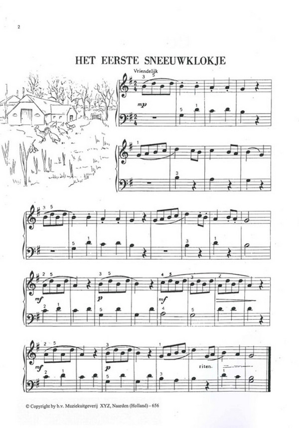 Het eerste sneeuwklokje Grootvader vertelt Dans om de lindeboom O, wat zijn wij heden blij Lang zal ze leven Soldatenliedje De vrolijke eendjes Het eerste verdriet Daar kwam enen boer uit zwitserland Spelevaren De dansende moor Optocht Een, twee, drie, vier Arend stokje De slapende olifant Reidans Een regendag De vlijtige pianist De zieke pop Kerstliedje Boerendans 'n prettige wandeling De ijscoman 'n wedloop Tietje, mijn bietje Mijn liedje is uit
