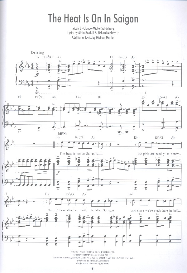 The heat is on in Saigon The movie in my mind Why god why Sun and moon The last night of the world I still believe If you want to die in bed I'd give my live for you Bui-doi Now that i've seen her The american dream Boublil, Alain, Text
