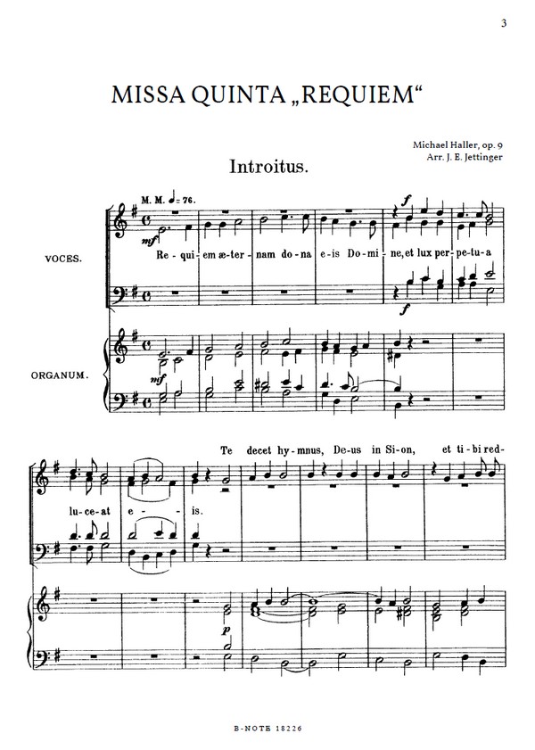 Fassung der eigentlich zweistimmigen Messe für Chor SATB. Bearbeitet und liturgisch um das Dies irea und das Libera me erweitert von Johann Evangelist Jettinger. Die Originalfassung ist ebenfalls erhältlich.