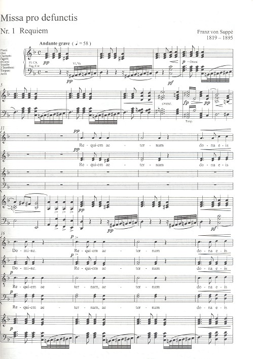 Requiem Franz von Suppè schrieb sein 'Requiem' nicht als allgemein menschliche oder pantheistische Totenklage, sondern als bewusst christlich-katholisches Bekenntniswerk. Dass es Suppè gelungen ist, ein Requiem zu komponieren, das den theologisch-liturgischen Rahmen einhält, ohne deshalb den Anspruch des autonom gestalteten Kunstwerkes aufzugeben, macht vielleicht den - bisher unbekannten - Rang des Werkes aus.