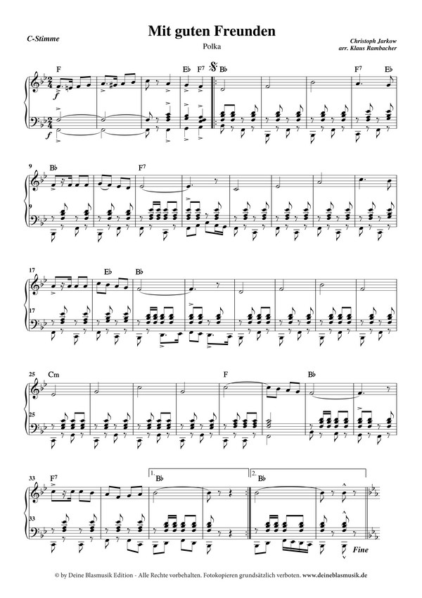 Rambacher, Klaus, arr. Polka Eine Polka, die auch von Unter- und Mittelstufenorchestern ohne großen Probeaufwand einstudiert und präsentiert werden kann. Die wunderschönen Melodien wechseln sich in den Registern ab und spielen mit Schwung nach vorne. Der Komponist Christoph Jarkow sagt mit dieser Polka den Musikern in seinen Orchestern sprichwörtlich: 'Schön, dass es Euch gibt!' Und sicherlich finden sich mit diesem Werk viele neue Freunde, denen man das Gleiche sagen kann.