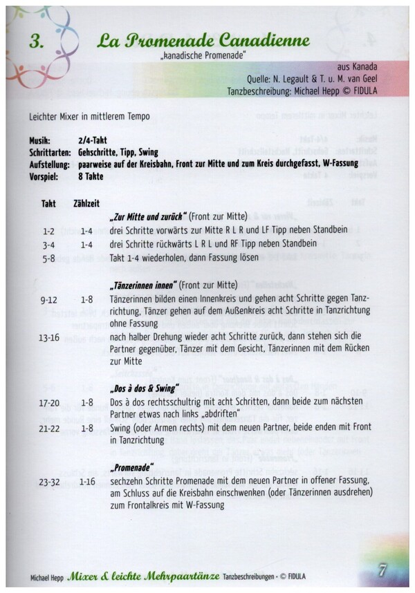 Mixer sind besonders abwechslungsreiche Tänze. Nirgendwo sonst ergeben sich so selbstverständlich Gelegenheiten, vielen anderen Mittanzenden zu begegnen. Sie werden paarweise getanzt, und dabei werden die jeweiligen Partner regelmäßig gewechselt. Bei den Mehrpaartänzen werden die Partner zwar nicht gewechselt, die Paare tanzen aber immer wieder mit einem anderen Partnerpaar. Da bei beiden Tanztypen das gesellige Miteinander und der Spaß im Vordergrund stehen, sind die Schritte und Schrittmuster in der Regel sehr einfach und daher auch für Ungeübte gut geeignet. Sowohl die Geselligkeit als auch ihre Einfachheit machen einen Einsatz bei Tanzbällen, Geburtstagsfeiern, Klassen- und Schulfesten besonders sinn- und wertvoll. Aber auch im Musik- und Sportunterricht können sie ihren Platz haben. Bei Folklore- und Volkstanzgruppen bieten sie eine schöne und willkommene Abwechslung zum sonstigen Programm. Mit der passenden Musik mit großem Aufforderungscharakter zaubern sie allen, die sich darauf einlassen, ein Lächeln ins Gesicht. 1. Doppelschottisch (Deutschland) 2. Jacks-Walzer-Mixer (Deutschland) 3. La Promenade Canadienne (Kanada) 4. Merry Circle Dance (England) 5. Andrews Mixer (Frankreich) 6. Ki-su-deki-Mixer (Kroatien) 7. Rechts-Links-Mixer (Deutschland) 8. Le Soleil dAlsace (Frankreich) 9. Saboljela Dunina Golovka (Russland) 10. Circolo-Polare-Mixer (Italien) 11. Valse des Montagnes Bleues (Frankreich) 12. Te Haerlem in den Houte (Niederlande) 13. Paths Tants (Osteuropa) 14. La Rueda (Spanien) 15. Polka des Allumettes (Frankreich) 16. Upon a Summers Day (England) 17. Witchs Reel (Schottland) 18. The Comical Fellow (England) 19. The Eastbourne Rover (USA/England) 20. Seemann-Mixer (B/NL/D)