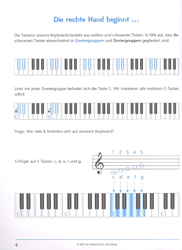 Die Keyboard-Anfangsschule für jedes Alter. Mit ausgeschriebenen Akkorden für die linke Hand. Das ideale Schulwerk für eine fundierte Ausbildung auf dem Keyboard. In 'mundgerechten' Lektionen erfährt der Schüler den Zugang zur Welt der Musik. Lektion 1 Notation und erstes Spiel Die Notenschrift Der Notenschlüssel Die rechte Hand beginnt Erstes Spiel Schreiben und spielen Check-Liste 1 Lektion 2 Die Notenwerte Klatschen und zählen Spielen und zählen Check-Liste 2 Lektion 3 3/4-Takt und Pausenzeichen 3/4-Takt (Dreivierteltakt) Die Pausenzeichen Spielen mit Pausen Check-Liste 3 Lektion 4 Die linke Hand Der Bassschlüssel Links, zwo, drei, vier Der Haltebogen Schreiben und spielen im Bassschlüssel Erstes Zusammenspiel beider Hände Check-Liste 4 Lektion 5 Spiel mit Akkorden Der Akkord Die Begleitautomatik Melodie und Akkorde Das Wiederholungszeichen Check-Liste 5 Lektion 6 Der erweiterte Tonraum 5 Finger für 8 Tasten Rhythmen & Styles Der Auftakt Der Split-Modus Check-Liste 6 Lektion 7 Der F-Akkord / Die Tonleiter Der F-Akkord Akkorde im Wechsel Liederverzeichnis Das Metrum Halbtonschritte - Ganztonschritte Die Achtelnote und Achtelpause Klatschen und zählen Das Wiederholungszeichen mit Klammern Check-Liste 7 Lektion 8 Die punktierte Viertelnote Recken und Strecken Der Septakkord Check-Liste 8 Liederverzeichnis
