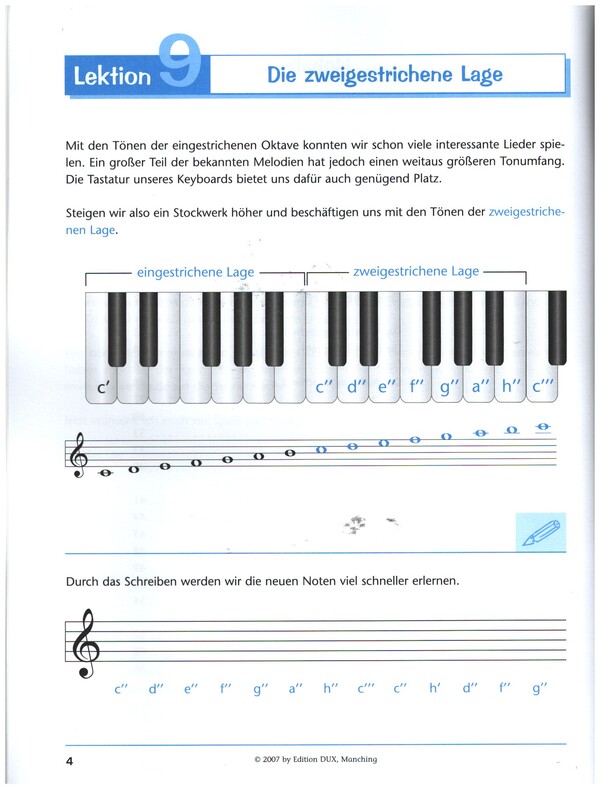 Fortsetzung der Keyboardschule. In vier Lektionen wird das Fundament der Ausbildung gefestigt und schrittweise erweitert. Check-Listen fassen das Erlernte zusammen und helfen dem Schüler mit Erfolgsmomenten. Lektion 9 Die zweigestrichene Lage Die Tonleiter über 2 Oktaven Der Phrasierungsbogen Check-Liste 9 Lektion 10 Das Versetzungszeichen Kreuz # Die G-Dur-Tonleiter Eine neue Tonart - ein neuer Akkord Der Alla Breve-Takt Das zweistimmige Spiel Der Taktwechsel (Rhythmuswechsel) Check-Liste 10 Lektion 11 Das Versetzungszeichen b Die F-Dur-Tonleiter Der C7-Akkord Das Auflösungszeichen Staccato Der Bb-Akkord finger-fit Der D-Moll-Akkord Check-Liste 11 Lektion 12 Die Akkordlagen Die Sechzehntelnoten / Der Zweivierteltakt Die punktierte Achtelnote Der Dreiachteltakt / Der Am-Akkord Der Sechsachteltakt Der A7-Akkord / Das Oktavierungszeichen Check-Liste 12 Liederverzeichnis Die Akkorde aus Band 1 und Band 2 Mini-Lexikon