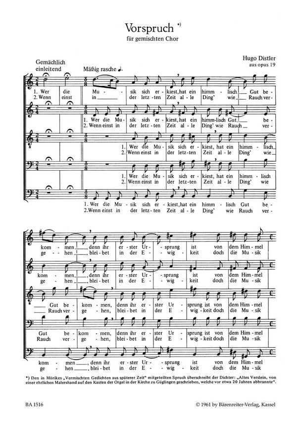 VORSPRUCH EIN STUENDLEIN WOHL VOR TAG JEDEM DAS SEINE LIEB IN DEN TOD DIE TRAURIGE KROENUNG AUF DEM SPAZIERGANG DER GAERTNER (1.FASSUNG) SUSCHENS VOGEL (2X) KINDERLIED FUER AGNES UM MITTERNACHT RITTERLICHE WERBUNG HANDWERKERLIED DER FEUERREITER SCHOEN ROHTRAUT DIE TOCHTER DER HEIDE (1.FASSUNG) DER KNABE UND DAS IMMELEIN STORCHENBOTSCHAFT NIMMERSATT LIEBE WANDERLIED DENK ES O SEELE SEHNSUCHT LEBEWOHL FRAGE UND ANTWORT (1.FASSUNG)