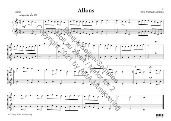 Minor for 2 12 Pieces in all Minor Keys 12 mittelschwere Klavierstücke zu vier Händen. Beginnend mit dem vorzeichenlosen A-Moll bewegen sie sich mit zunehmender Vorzeichenanzahl durch sämtliche 12 Molltonarten. Jedes Klavierstück hat einen anderen Charakter, der durch die französischen Titelbezeichnungen umschrieben wird. Die Taktarten reichen vom 3/4 und 4/4 Takt bis hin zu 5/8, 7/8, 8/8, 9/8 und 10/8 Takt. Die Klavierstücke helfen die Angst vor Klavierstücken mit 'zu vielen' Vorzeichen und ungewohnten Taktarten zu nehmen und öffnen spielerisch eine Tür zur Welt der Vielfalt und Buntheit der Musik zu. Allons Musette Caprice Impromptu Nocturne Ballade Prelude Valse irreguliere Arabeske Furieux Intermezzo Berceuse